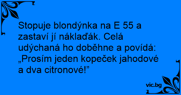 Stopuje blondýnka na E 55 a zastaví jí náklaďák. Celá udýchaná hо doběhne a povídá: „Prosím jeden kopeček jahodové a dva citronové!”