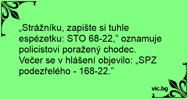 „Strážníku, zapište si tuhle espézetku: STO 68-22,” oznamuje policistovi poražený chodec.
