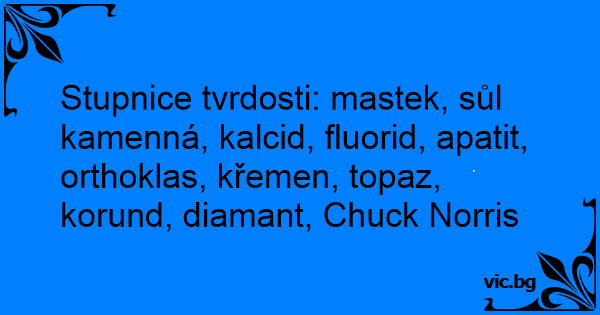 Stupnice tvrdosti: mastek, sůl kamenná, kalcid, fluorid, apatit, orthoklas, křemen, topaz, korund, diamant, Chuck Norris