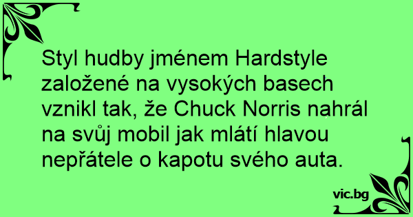 Styl hudby jménem Hardstyle založené na vysokých basech vznikl tak, že Chuck Norris nahrál na svůj mobil jak mlátí hlavou nepřátele o kapotu svého auta.