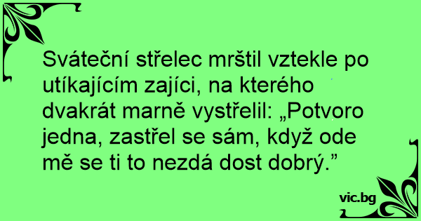 Sváteční střelec mrštil vztekle po utíkajícím zajíci, na kterého dvakrát marně vystřelil: „Potvoro jedna, zastřel se sám, když ode mě se ti to nezdá dost dobrý.”