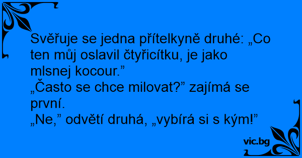 Svěřuje se jedna přítelkyně druhé: „Co ten můj oslavil čtyřicítku, je jako mlsnej kocour.”