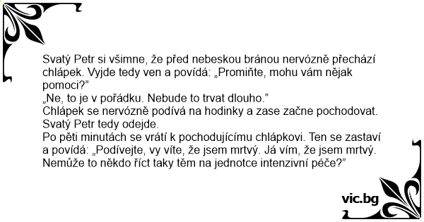 Svatý Petr si všimne, že před nebeskou bránou nervózně přechází chlápek. Vyjde tedy ven a povídá: „Promiňte, mohu vám nějak pomoci?”
