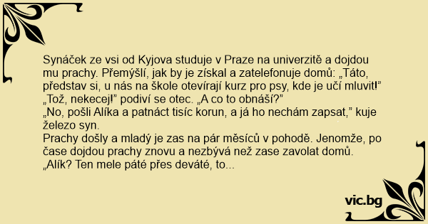 Synáček ze vsi od Kyjova studuje v Praze na univerzitě a dojdou mu prachy. Přemýšlí, jak by je získal a zatelefonuje domů: „Táto, představ si, u nás na škole otevírají kurz pro psy, kde je učí mluvit!”