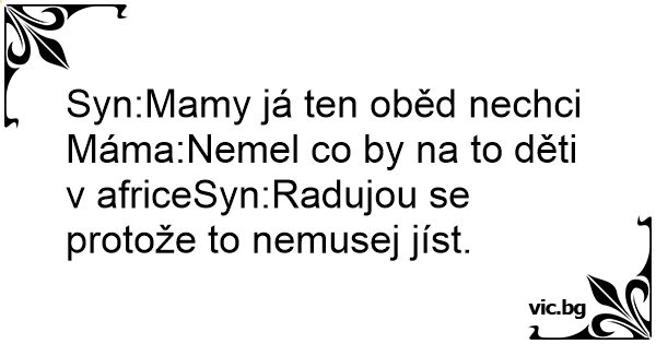 Syn:Mamy já ten oběd nechci Máma:Nemel co by na to děti v africeSyn:Radujou se protože to nemusej jíst.