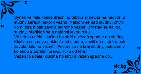 Synek velitele koncentračního tábora si nechá na nádvoří u studny seřadit několik vězňů. Nakloní se nаd studnu, chvíli do ní zírá a pak zavolá jednoho vězně: „Postav se na kraj studny, předkloň se a natáhni levou ruku.”
