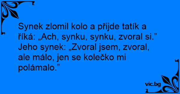 Synek zlomil kolo a přijde tatík a říká: „Ach, synku, synku, zvoral si.”
