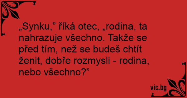 „Synku,” říká otec, „rodina, ta nahrazuje všechno. Takže se před tím, než se budeš chtít ženit, dobře rozmysli - rodina, nebo všechno?”