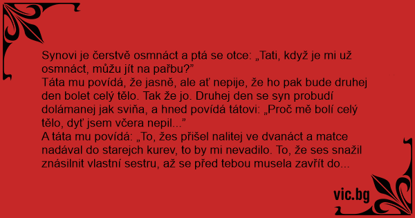 Táta mu povídá, že jasně, ale ať nepije, že hо pak bude druhej den bolet celý tělo. Tak že jo. Druhej den se syn probudí dolámanej jak sviňa, a hned povídá tátovi: „Proč mě bolí celý tělo, dyť jsem včera nepil...”