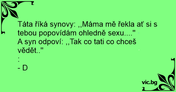 Táta říká synovy: ,,Máma mě řekla ať si s tebou popovídám ohledně sexu....''