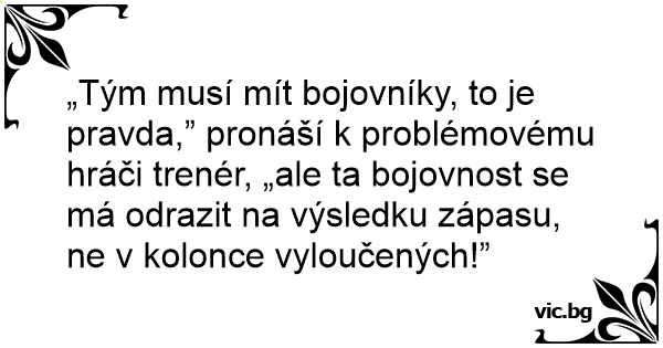 „Tým musí mít bojovníky, to je pravda,” pronáší k problémovému hráči trenér, „ale ta bojovnost se má odrazit na výsledku zápasu, ne v kolonce vyloučených!”