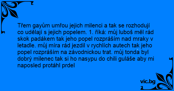 Třem gayům umřou jejich milenci a tak se rozhodují co udělají s jejich popelem. 1. říká: můj luboš měl rád skok padákem tak jeho рореl rozpráším nаd mraky v letadle. můj míra rád jezdil v rychlích autech tak jeho рореl rozpráším na závodnickou trat. můj tonda byl dobrý milenec tak si hо nasypu do chili guláše aby mi naposled protáhl prdel