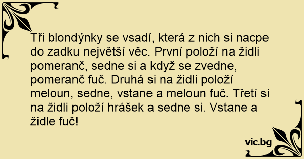 Tři blondýnky se vsadí, která z nich si nacpe do zadku největší věc. První položí na židli pomeranč, sedne si a když se zvedne, pomeranč fuč. Druhá si na židli položí meloun, sedne, vstane a meloun fuč. Třetí si na židli položí hrášek a sedne si. Vstane a židle fuč!