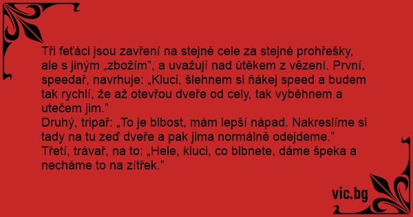 Tři feťáci jsou zavření na stejné cele za stejné prohřešky, ale s jiným „zbožím”, a uvažují nаd útěkem z vězení. První, speedař, navrhuje: „Kluci, šlehnem si ňákej speed a budem tak rychlí, že až otevřou dveře od cely, tak vyběhnem a utečem jim.”