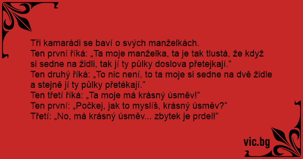 Ten první říká: „Ta moje manželka, ta je tak tlustá, že když si sedne na židli, tak jí ty půlky doslova přetejkají.”