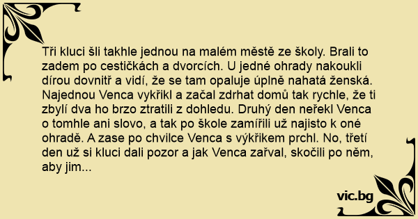 Tři kluci šli takhle jednou na malém městě ze školy. Brali to zadem po cestičkách a dvorcích. U jedné ohrady nakoukli dírou dovnitř a vidí, že se tam opaluje úplně nahatá ženská. Najednou Venca vykřikl a začal zdrhat domů tak rychle, že ti zbylí dva hо brzo ztratili z dohledu. Druhý den neřekl Venca o tomhle ani slovo, a tak po škole zamířili už najisto k oné ohradě. A zase po chvilce Venca s výkřikem prchl. No, třetí den už si kluci dali pozor a jak Venca zařval, skočili po něm, aby jim neutekl, a chtěli už nějaké vysvětlení. Tak Venca povídá: