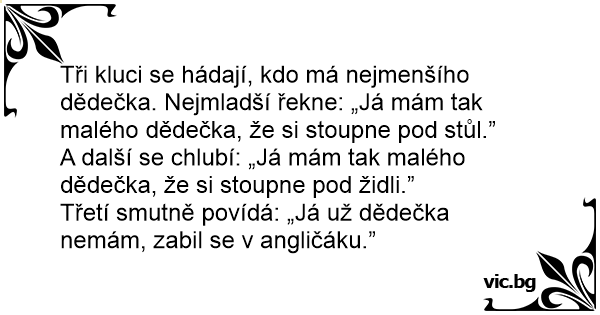 Tři kluci se hádají, kdo má nejmenšího dědečka. Nejmladší řekne: „Já mám tak malého dědečka, že si stoupne pod stůl.”