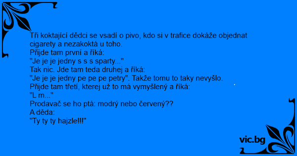 Tři koktající dědci se vsadí o pivo, kdo si v trafice dokáže objednat cigarety a nezakoktá u toho.