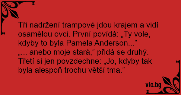 Tři nadržení trampové jdou krajem a vidí osamělou ovci. První povídá: „Ty vole, kdyby to byla Pamela Anderson...”