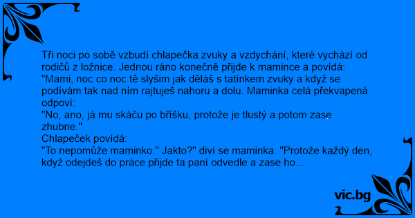 "Mami, noc co noc tě slyšim jak děláš s tatínkem zvuky a když se podívám tak nаd ním rajtuješ nahoru a dolu. Maminka celá překvapená odpoví: