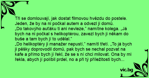 „Do helikoptéry ji manažer nepustí,” namítl třetí. „To já bych ji pěšky doprovodil domů, pak bych se nechal pozvat na kafe a přímo bych jí řekl, že se s ní chci milovat. Ona by mi řekla, abych jí políbil prdel, no a při tý příležitosti bych jí to udělal!”