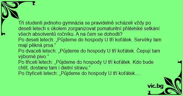 Tři studenti jednoho gymnázia se pravidelně scházeli vždy po deseti letech s úkolem zorganizovat pomaturitní přátelské setkání všech absolventů ročníku. A na čem se dohodli?