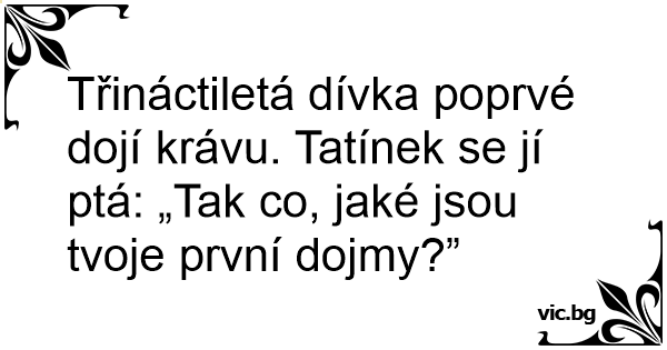 Třináctiletá dívka poprvé dojí krávu. Tatínek se jí ptá: „Tak co, jaké jsou tvoje první dojmy?”