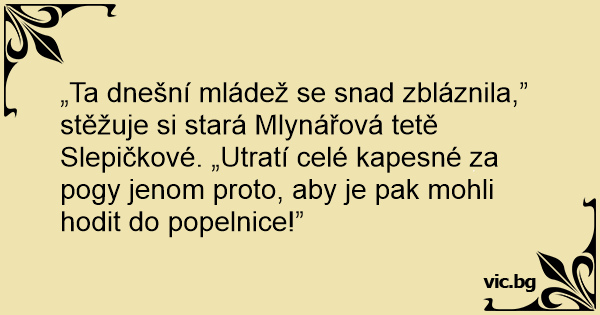 „Ta dnešní mládež se snad zbláznila,” stěžuje si stará Mlynářová tetě Slepičkové. „Utratí celé kapesné za pogy jenom proto, aby je pak mohli hodit do popelnice!”