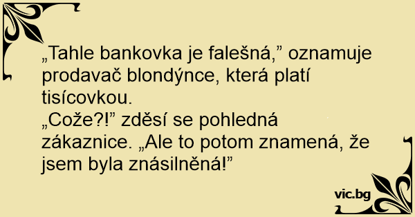 „Cože?!” zděsí se pohledná zákaznice. „Ale to potom znamená, že jsem byla znásilněná!”