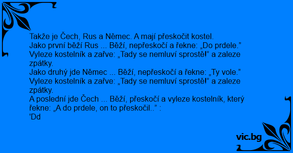 A poslední jde Čech ... Běží, přeskočí a vyleze kostelník, který řekne: „A do prdele, on to přeskočil..” :