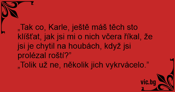 „Tak co, Karle, ještě máš těch sto klíšťat, jak jsi mi o nich včera říkal, že jsi je chytil na houbách, když jsi prolézal roští?”