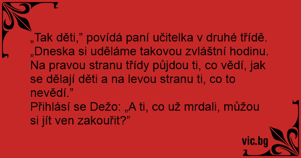 „Tak děti,” povídá paní učitelka v druhé třídě. „Dneska si uděláme takovou zvláštní hodinu. Na pravou stranu třídy půjdou ti, co vědí, jak se dělají děti a na levou stranu ti, co to nevědí.”