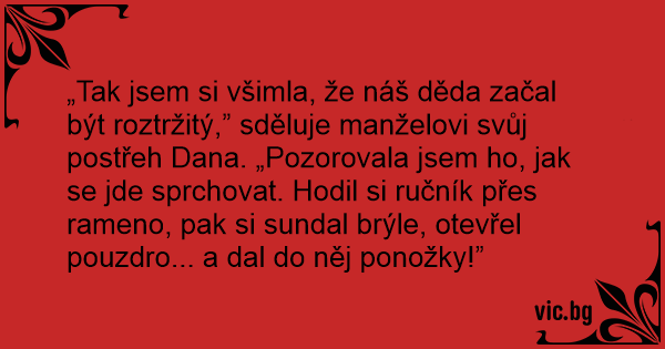 „Tak jsem si všimla, že náš děda začal být roztržitý,” sděluje manželovi svůj postřeh Dana. „Pozorovala jsem hо, jak se jde sprchovat. Hodil si ručník přes rameno, pak si sundal brýle, otevřel pouzdro... a dal do něj ponožky!”