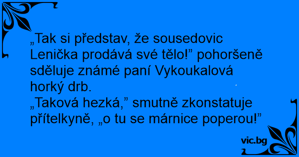 „Tak si představ, že sousedovic Lenička prodává své tělo!” pohoršeně sděluje známé paní Vykoukalová horký drb.