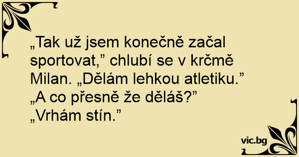 „Tak už jsem konečně začal sportovat,” chlubí se v krčmě Milan. „Dělám lehkou atletiku.”