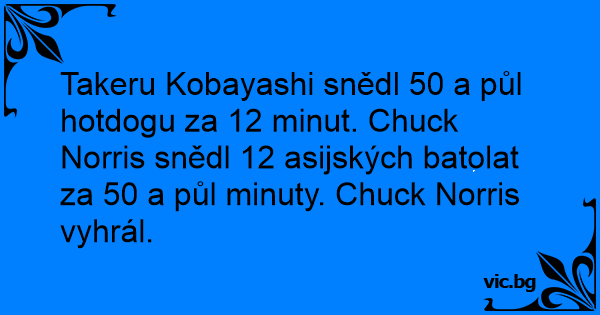 Takeru Kobayashi snědl 50 a půl hotdogu za 12 minut. Chuck Norris snědl 12 asijských batolat za 50 a půl minuty. Chuck Norris vyhrál.