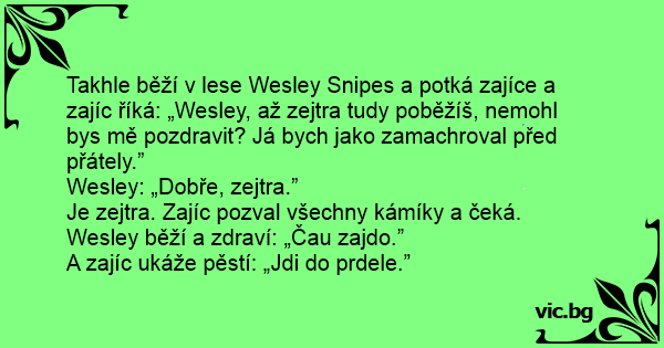 Takhle běží v lese Wesley Snipes a potká zajíce a zajíc říká: „Wesley, až zejtra tudy poběžíš, nemohl bys mě pozdravit? Já bych jako zamachroval před přátely.”