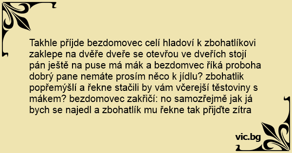 Takhle příjde bezdomovec celí hladoví k zbohatlíkovi zaklepe na dvěře dveře se otevřou ve dveřích stojí pán ještě na puse má mák a bezdomvec říká proboha dobrý pane nemáte prosím něco k jídlu? zbohatlik popřemýšlí a řekne stačili by vám včerejší těstoviny s mákem? bezdomovec zakřičí: no samozřejmě jak já bych se najedl a zbohatlík mu řekne tak přijďte zítra