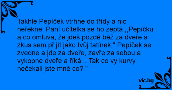 Takhle Pepíček vtrhne do třídy a nic neřekne. Paní učitelka se hо zeptá ,,Pepíčku a co omluva, že jdeš pozdě běž za dveře a zkus sem přijít jako tvůj tatínek." Pepíček se zvedne a jde za dveře, zavře za sebou a vykopne dveře a říká ,, Tak co vy kurvy nečekali jste mně co? "