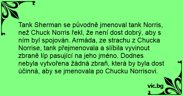 Tank Sherman se původně jmenoval tank Norris, než Chuck Norris řekl, že není dost dobrý, aby s ním byl spojován. Armáda, ze strachu z Chucka Norrise, tank přejmenovala a slíbila vyvinout zbraně líp pasující na jeho jméno. Dodnes nebyla vytvořena žádná zbraň, která by byla dost účinná, aby se jmenovala po Chucku Norrisovi.