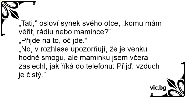„No, v rozhlase upozorňují, že je venku hodně smogu, ale maminku jsem včera zaslechl, jak říká do telefonu: Přijď, vzduch je čistý.”