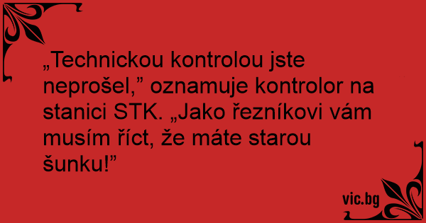„Technickou kontrolou jste neprošel,” oznamuje kontrolor na stanici STK. „Jako řezníkovi vám musím říct, že máte starou šunku!”