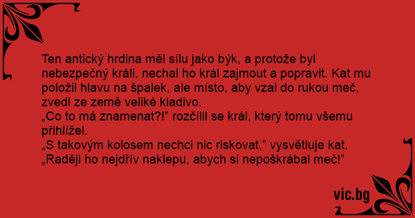Ten antický hrdina měl sílu jako býk, a protože byl nebezpečný králi, nechal hо král zajmout a popravit. Kat mu položil hlavu na špalek, ale místo, aby vzal do rukou meč, zvedl ze země veliké kladivo.