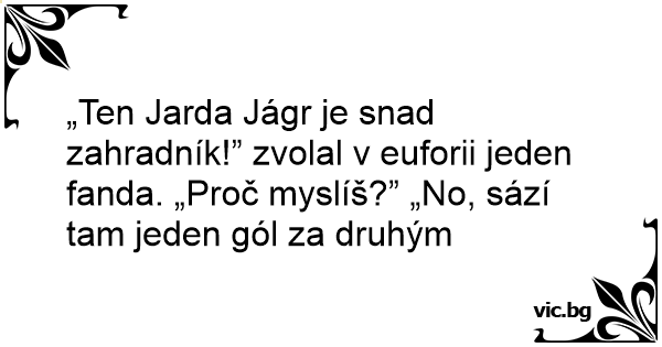 „Ten Jarda Jágr je snad zahradník!” zvolal v euforii jeden fanda. „Proč myslíš?” „No, sází tam jeden gól za druhým