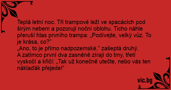 Teplá letní noc. Tři trampové leží ve spacácích pod širým nebem a pozorují noční oblohu. Ticho náhle přeruší hlas prvního trampa: „Podívejte, velký vůz. To je krása, co?”
