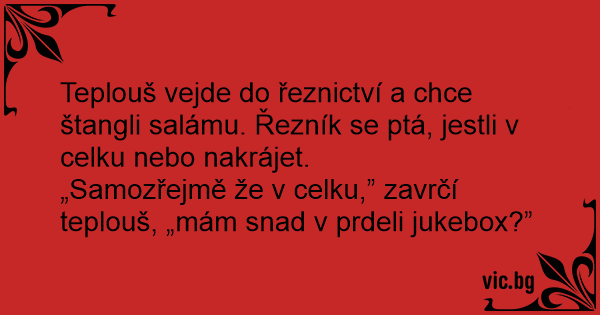 Teplouš vejde do řeznictví a chce štangli salámu. Řezník se ptá, jestli v celku nebo nakrájet.