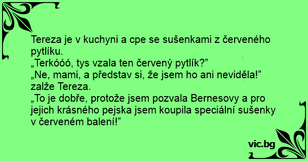 „To je dobře, protože jsem pozvala Bernesovy a pro jejich krásného pejska jsem koupila speciální sušenky v červeném balení!”
