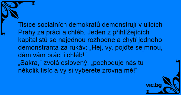 Tisíce sociálních demokratů demonstrují v ulicích Prahy za práci a chléb. Jeden z přihlížejících kapitalistů se najednou rozhodne a chytí jednoho demonstranta za rukáv: „Hej, vy, pojďte se mnou, dám vám práci i chléb!”
