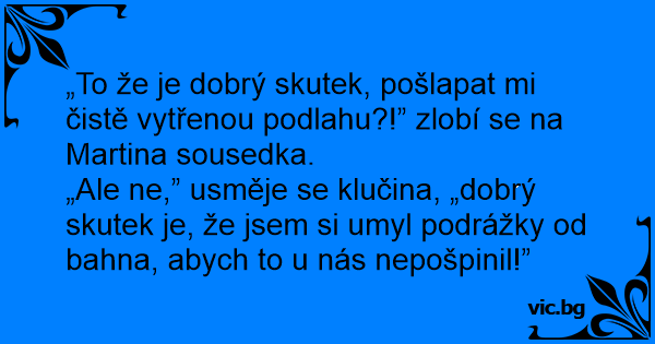 „To že je dobrý skutek, pošlapat mi čistě vytřenou podlahu?!” zlobí se na Martina sousedka.