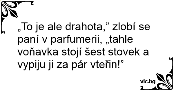 „To je ale drahota,” zlobí se paní v parfumerii, „tahle voňavka stojí šest stovek a vypiju ji za pár vteřin!”